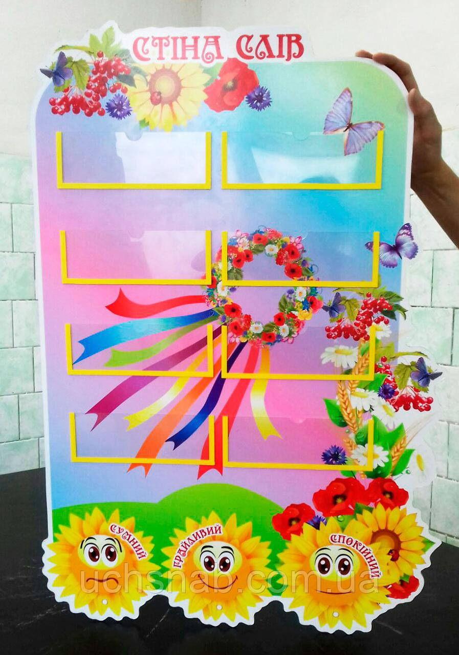 Стенд стіна слів необхідний в кожному класі та включено до переліку рекомендацій мон. В розташовані кишені вчитель вкладає аркуш з написом слова. Раз на тиждень сліва міняються. В останній день діти повинні знати правильне написання та сенс всіх запропонованих слів.