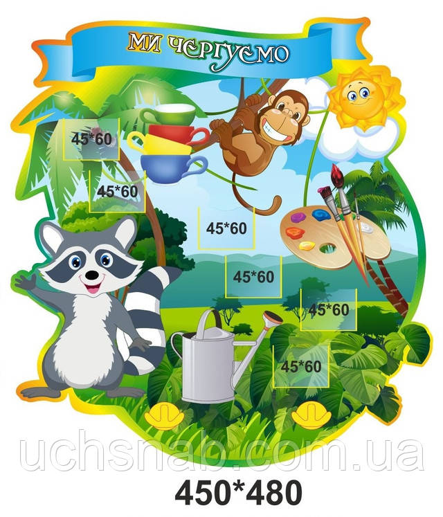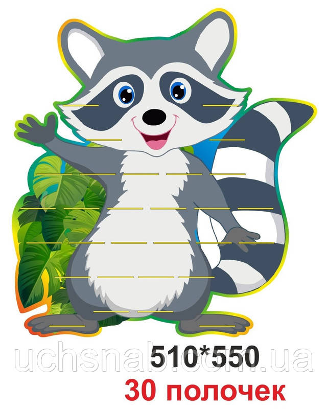 - Набір стендів для дитячого садка "Группа Єнот" призначений для 30 дітей.