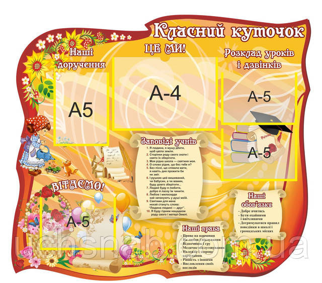 При Вашому бажанні, оформлення класу нуш ми можемо змінити: за розмірами, кольорами, текстами стендів, наявністю фурнітури, матеріалами, нанести ламінацію для захисту від подряпин.