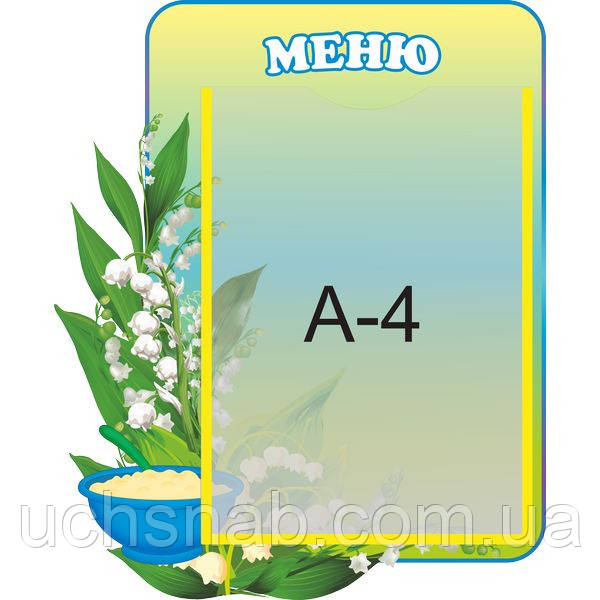 Арт. ЦЛН-8 Стенд «Меню» Розмір: 335 х 405 мм Фурнітура: Кишеня А4 Ціна — 99 грн |