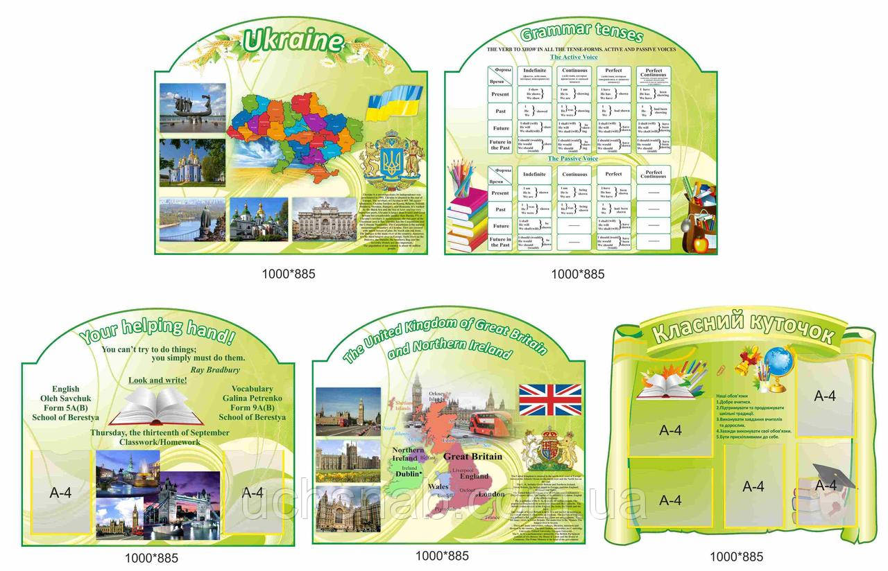 Сучасні навчальні кабінети мають закріпленого за ними вчителя та клас. Тому актуально розглянути класний куточок в кабінет англійської мови спеціальний. Зазвичай педагог вирішує яким буде дизайн кімнати та плакати, потім за індивідуальними потребами (залежно від віку дітей) створюється класний куточок в такому ж вигляді. Написи друкуються на іноземній мові, так стенд допомогає проводити виховну роботу.