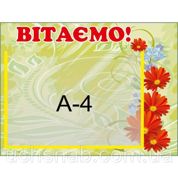 - Стенд для школи «Вітаємо!» виготовлений з МДФ-3 мм (економ) з нанесенням кольорової плівки.