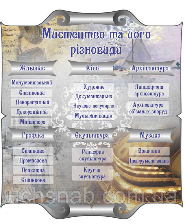 Арт. КТР-6 Стенд "Види мистецтва, класифікація" Розмір: 920 х 1050 мм Ціна — 558 грн |